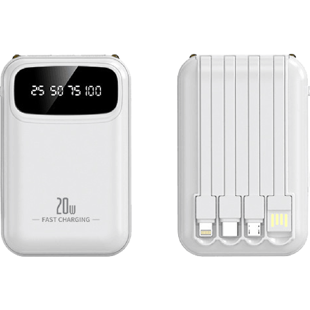 پاوربانک کیوت مدل DX245 ظرفیت 20000 میلی آمپر ساعت فست شارژ رنگ سفیدبا پاوربانک کابل دار مدل Power Bank 20000mAh، همیشه شارژ داشته باشید! این پاوربانک با ظرفیت 20000 میلی آمپر، همراه با کابلهای داخلی USB-C و Lightning، بهترین انتخاب برای شارژ سریع و همزمان دستگاههای شماست.