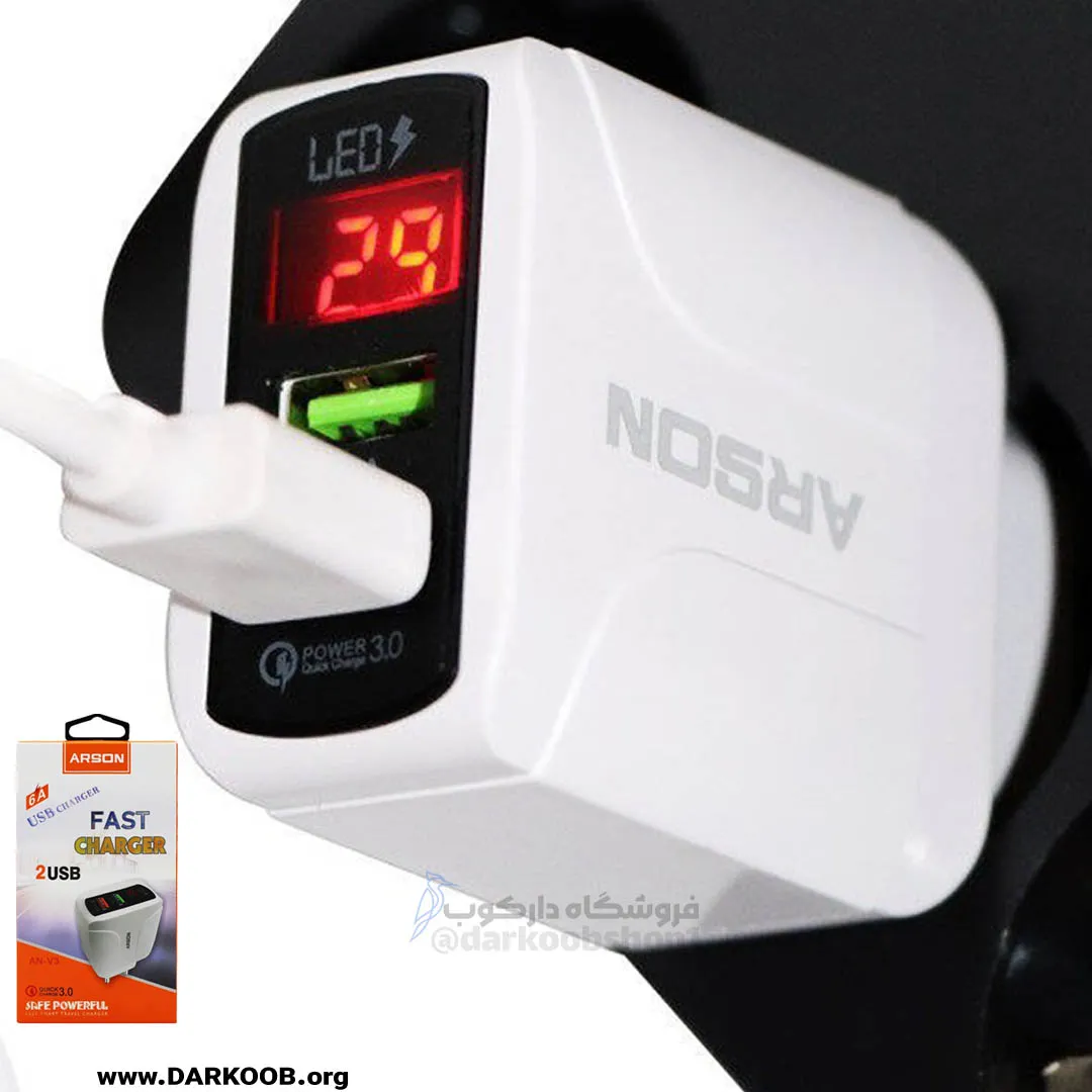 شارژر دیواری آرسون مدل AN-V3 به همراه کابل تبدیل USB به Type cشارژر دیواری آرسون (ARSON) مدل AN-V3 با داشتن دو خروجی USB و ولتاژ خروجی 5 ولت و شدت جریان 3.0 آمپر قادر است انواع گوشی های موبایل، تبلت، اسمارت واچ و … را با سرعت بالا شارژر کند. از ویژگی های متمایز این محصول می توان به نشانگر LED اشاره کرد که میزان شدت جریان خروجی را نشان می دهد. بدنه این آداپتور، پلاستیکی بوده و از کیفیت ساخت قابل قبولی هم برخوردار است. شارژر دیواری AN-V3، ولتاژ ورودی، ابعاد و وزنی برابر با 100-240 ولت، 90x45x20 میلی متر و 48 گرم را داراست که کوچک و سبک بودن و قابل حمل بودن این آداپتور، از دیگر ویژگی های این محصول شگفت انگیز است. در پک این محصول یک کابل میکرو به طول 1 متر قراردارد.