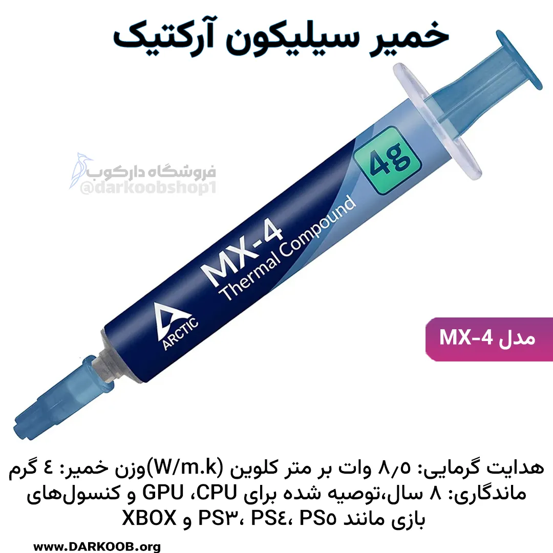 خمیر سیلیکون آرکتیک مدل MX-4خمیر سیلیکون 4 گرمی حرفه ای ARCTIC MX-4 یا خمیر حرارتی ماده ای است که رابط انتقال حرارت از روی چیپ به روی هیت سینک است. این رسانای گرمایی بین دو قطعه فلزی مورد استفاده قرار میگیرد که معمولاً این دو قطعه پردازنده و سیستم خنک کننده یا هیتسینک هستند. توسط این خمیر گرما میان پردازنده و هیتسینک جابجا شده و باعث کارکرد بهتر پردازنده می شود.