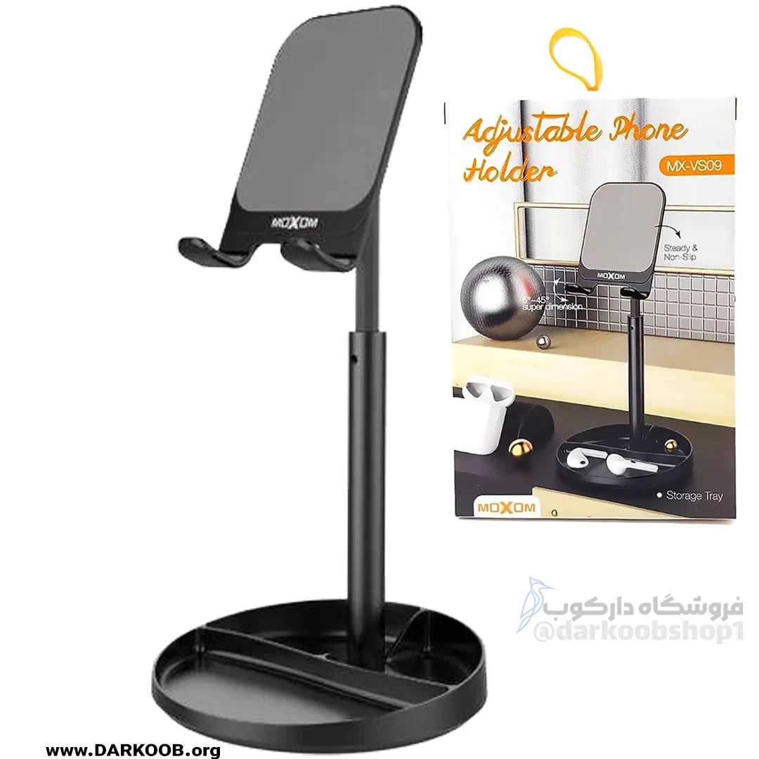 هولدر MOXOM موکسوم MX-VS09هولدر رومیزی موبایل و تبلت موکسوم مدل MX-VS09 برای همه سایز های گوشی موبایل و تبلت مناسب است. قابلیت تنظیم زاویه تا 45 درجه را دارد. چرخش 360 درجه و جای لوازم و ایرپاد نیز دارد. همچنین دارای فناوری تنظیم ارتفاع از 16 تا 21 سانت است و جنس بدنه آن از ABS مقاوم و پایه فلزی است.