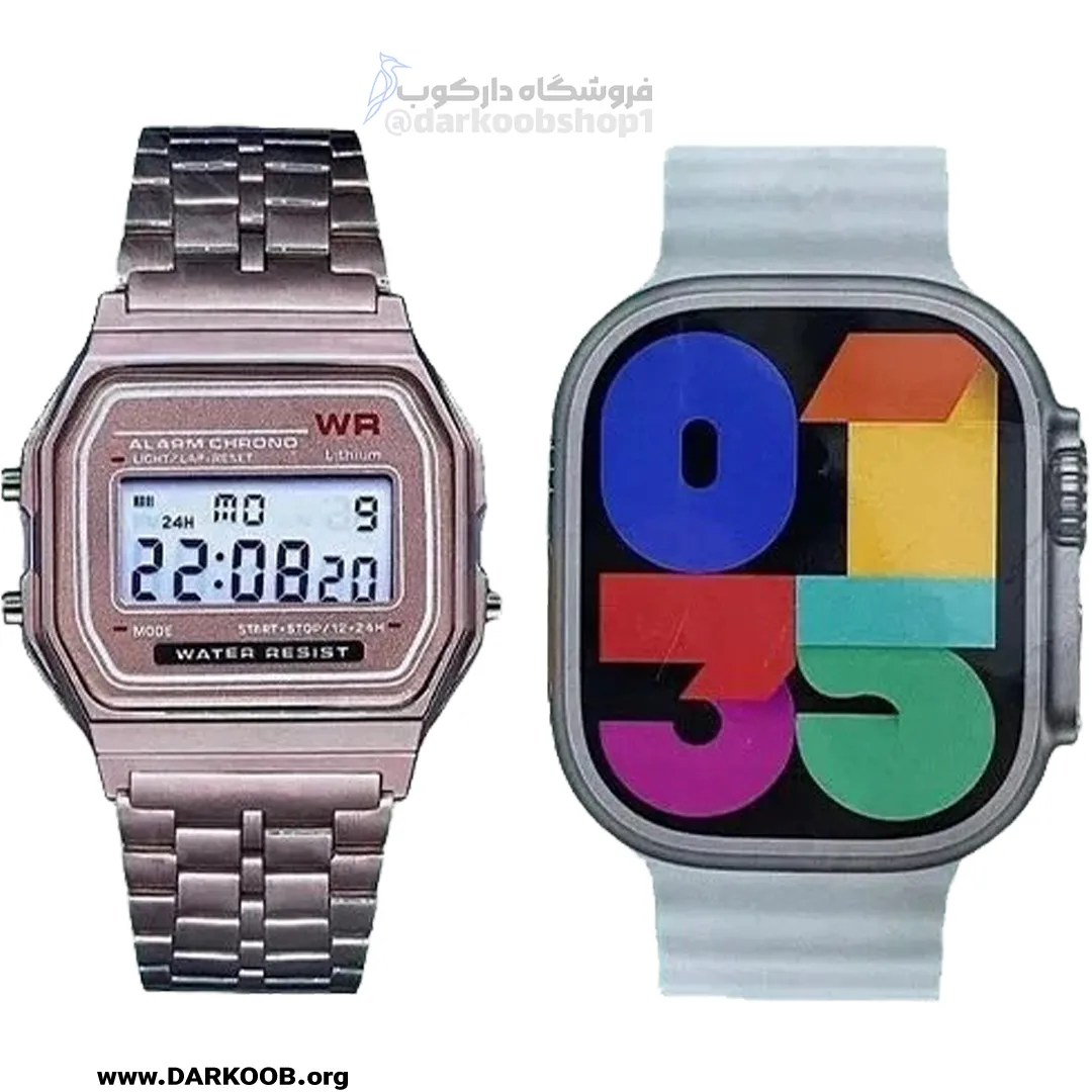پک ساعت هوشمند و ساعت دیجیتال مدل TK300 ULTRAساعت های هوشمند با قابلیت های گسترده برای امور مختلف کارایی دارند که از جمله این قابلیت ها می توان به کنترل وضعیت سلامتی و حالت های مختلف ورزشی اشاره کرد. ساعت هوشمند مدل TK300 Ultra محصولی با دوام است که دارای سنسورهای دقیق برای کنترل 24 ساعته وضعیت جسمانی است. نمایشگر این ساعت از نوع LED بوده و تصاویر از زوایای مختلف به درستی دیده می شوند. سنسورهای کنترل سلامتی ساعت هوشمند مدل TK300 Ultra با داشتن سنسور ضربان قلب و سنجش سطح اکسیژن خون (SpO2)؛ دارای قابلیت کنترل ضربان قلب، سطح اکسیژن خون، سطح استرس و بررسی وضعیت خواب می باشد. البته توجه داشته باشید که این یک دستگاه پزشکی نبوده و در صورت دریافت آلارم از نظر وضعیت جسمانی باید به پزشک مراجعه فرمایید. وجود حالت های مختلف ورزشی موجب شده تا کاربران علاقمند به ورزش بتوانند ورزش مورد علاقه خود را انجام دهند. سایر امکانات ساعت هوشمند مدل TK300 Ultra با وجود داشتن میکروفون و اسپیکر می تواند از طریق بلوتوث و در حالت متصل به گوشی برای پاسخ به مکالمات مورد استفاده قرار گیرد. ساعت زنگدار، کورنومتر، کنترل دوربین گوشی، هواشناسی و … از جمله سایر امکانات این ساعت هوشمند می باشد. نمایشگر LED نمایشگر استفاده شده در ساعت هوشمند مدل TK300 Ultra از نوع LED می باشد و تصاویر با کیفیت HD را با وضوح بالا به نمایش می گذارد.